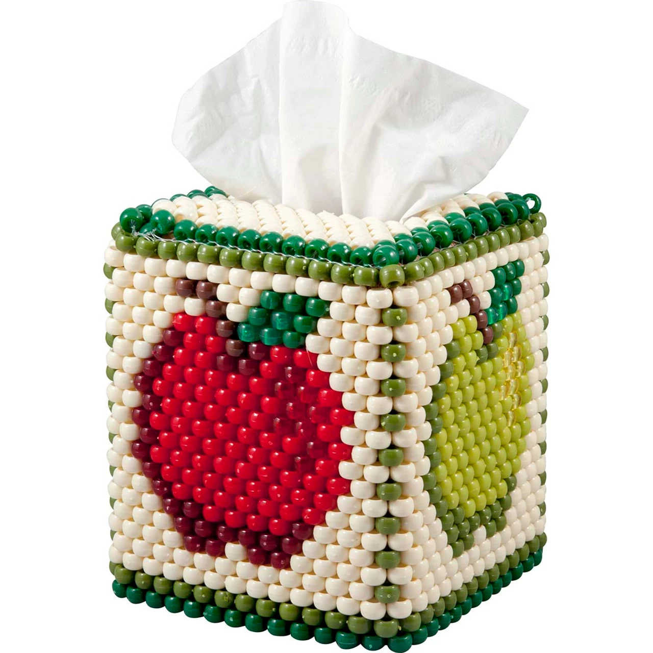 • Pony bead tissue box cover features apples in shades of red, yellow, and green.
