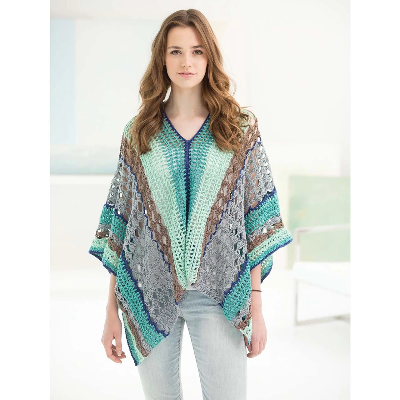 The flattering drape of this lacy poncho is perfect for layering on cool-weather days. Stitched in Lion Brand 24/7 Cotton yarn, the easy crochet poncho is worked sideways in two halves, then seamed together to create the eye-catching mirrored striping pattern. This poncho kit includes the yarn and easy crochet instructions. This 38 x 23″ (97 x 58cm) design requires a US size G-6 (4mm) hook to complete (not included). Imported.